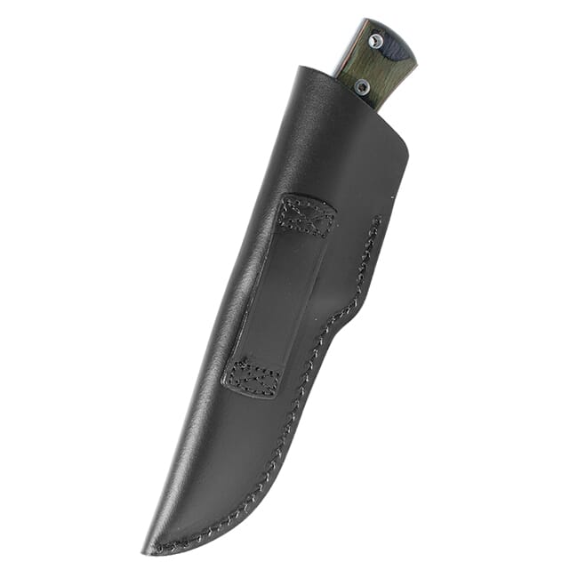 The contoured handle of the GRS Femund is designed to give the user a comfortable but stable grip on the knife and features the same laminated birch wood found on GRS stocks. The hardware on the handle of the knife consists of two large hex bolts, steel tube protecting the lanyard hole, and a polished finger-guard. The GRS Femund’s sheath follows the traditionally Scandinavian deep sheath style that securely holds the knife without the use of a straps or buttons.