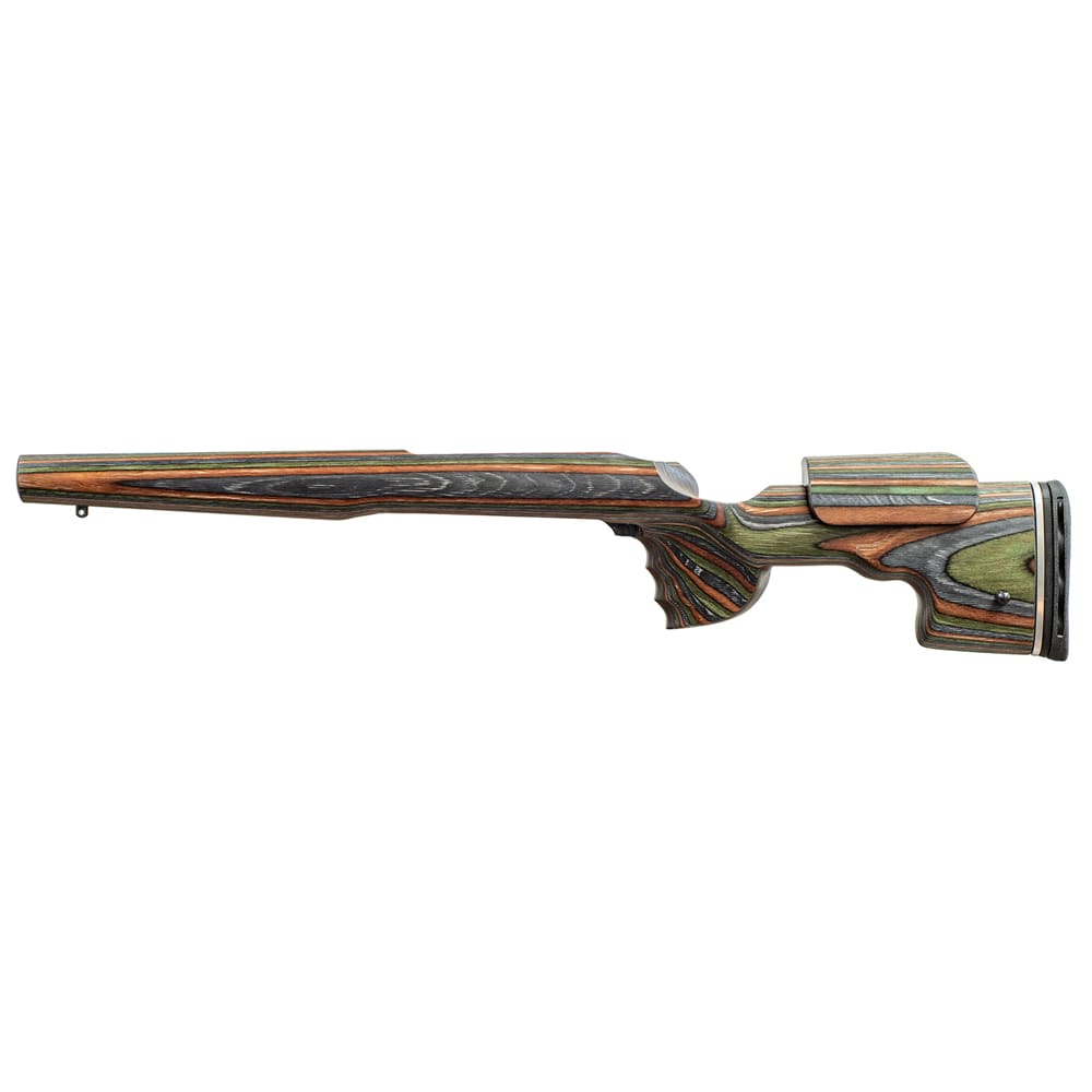 The GRS Sporter Mauser M18 Green Mountain Camo Stock is a fully adjustable laminate rifle stock built for ergonomic precision and adaptability. With a Green Mountain camouflage finish, this version retains the proven GRS Sporter platform’s push‑button SpeedLock system for quick, tool‑free adjustment of length of pull and cheek height to suit individual shooters and positions. Constructed from birch laminate, it offers strength and stability while weighing in at approximately 3.04lbs. With a total length of about 29.9" and a fore-end width of 53 mm, it presents a balanced, capable stock form ideal for Mauser M18 rifles. The package typically includes the stock, two QD sling swivels, a user manual, and decals.