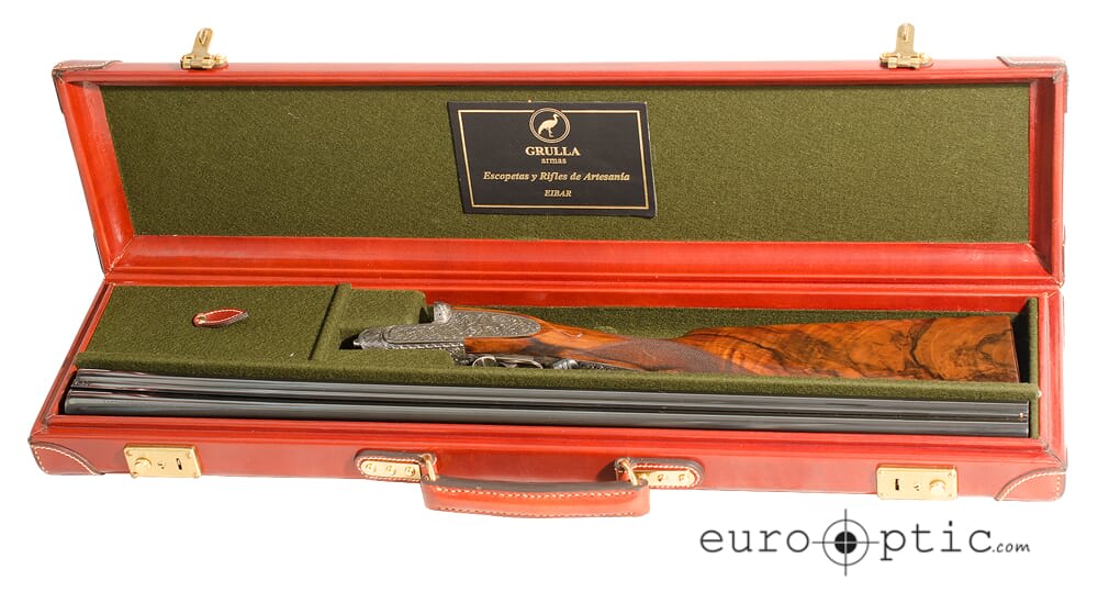 All engravings on this side-by-side shotgun were done by hand and are intricately detailed—the only way to truly appreciate the incredibly detail and craftsmanship of this shotgun is to hold it in your hands. The stock of the Grulla Royal is made from exhibition grade Turkish walnut that has been given a hand rubbed oil finish that brings out the best of the wood grain. The shotgun comes with a lockable leather hard case that is fitted perfectly for this shotgun. To protect the leather of the hard case there is a canvas soft case that fits the hard case like a glove.