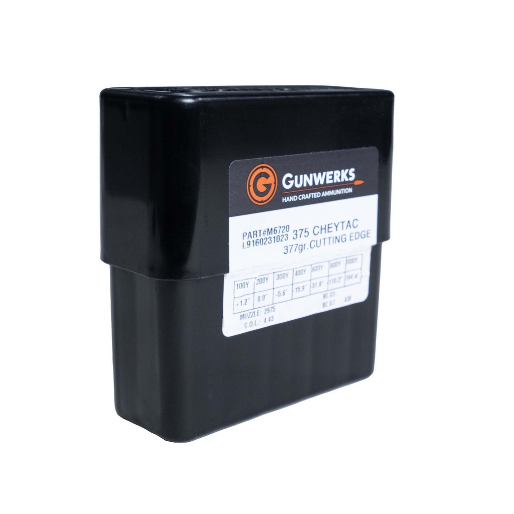 The Gunwerks .375 Cheytac Cutting Edge 377gr Precision Lead-Free Ammunition features a solid copper monolithic MTAC (Match/Tactical) bullet designed for exceptional long-range performance. Hand-loaded with meticulous attention to detail, this ammunition offers high ballistic coefficients and consistent muzzle velocities, making it ideal for extreme long-range hunting and precision shooting. The lead-free design complies with hunting regulations in lead-restricted areas, ensuring ethical and effective performance on large game. Please note that the cartridge overall length (COAL) is 4.430 inches, which may not fit in all factory box magazines; verify compatibility with your rifle before use.