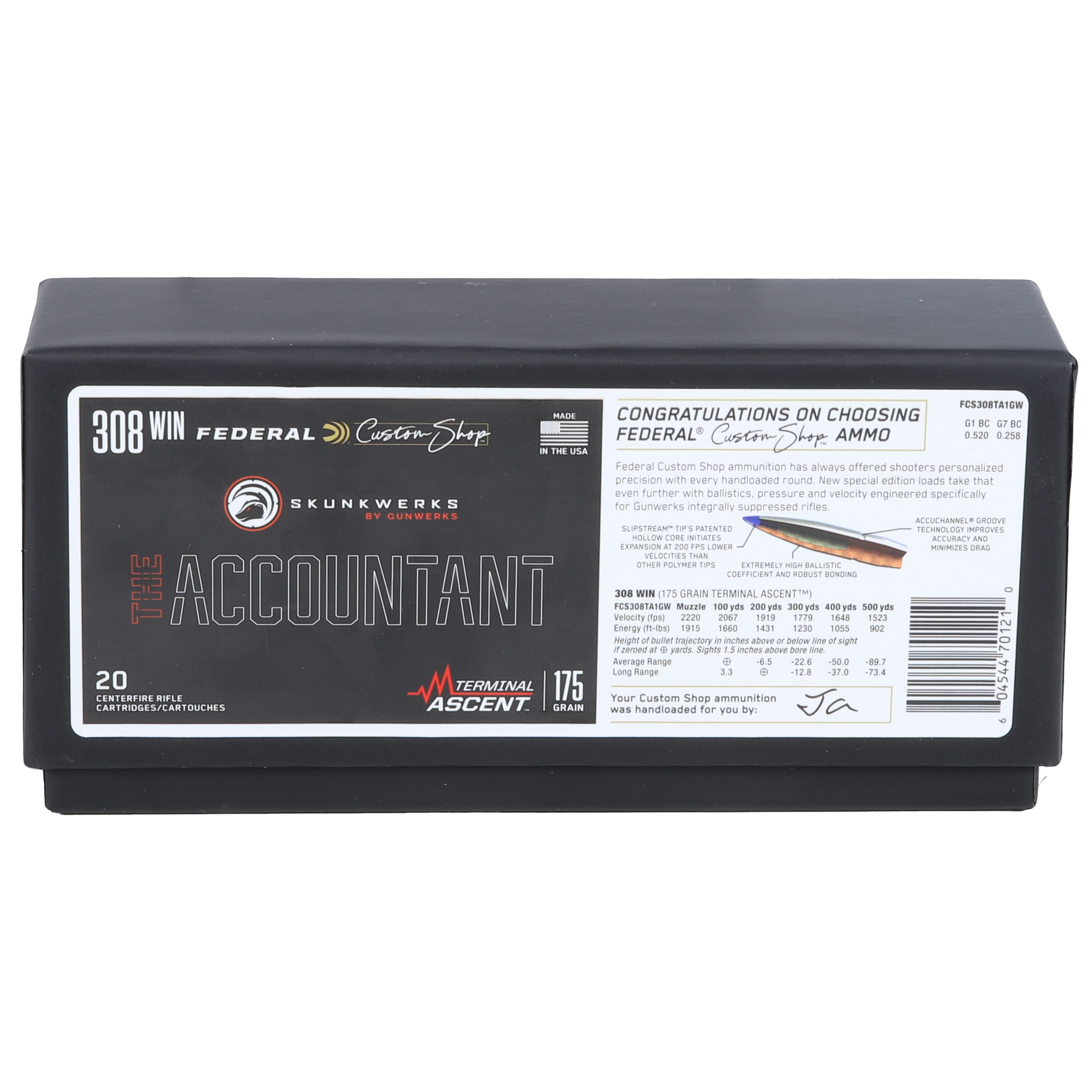 The Gunwerks Skunkwerks Federal .308 is a precision .308 Winchester load developed for consistent accuracy and dependable performance in precision shooting and hunting applications. Designed in collaboration with Federal’s production quality, this round delivers consistent muzzle velocities, tight group-making performance, and reliable feeding in bolt-action and semi-automatic rifles chambered for .308 Win. It’s intended for precision shooters who want factory ammunition tuned for match-grade results and dependable terminal performance.