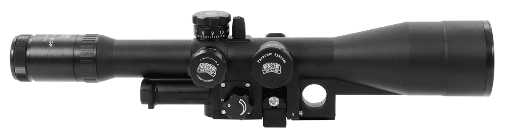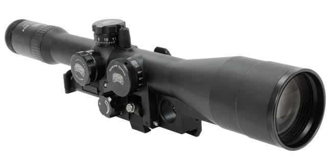 This Hensoldt ZF SSG-P 3-12x56 riflescope with an illuminated mil dot reticle in the first focal plane features a 34mm tube, matte black finish, .1 MRAD click adjustment, colored index lines on the elevation knob, and a parallax adjustment.