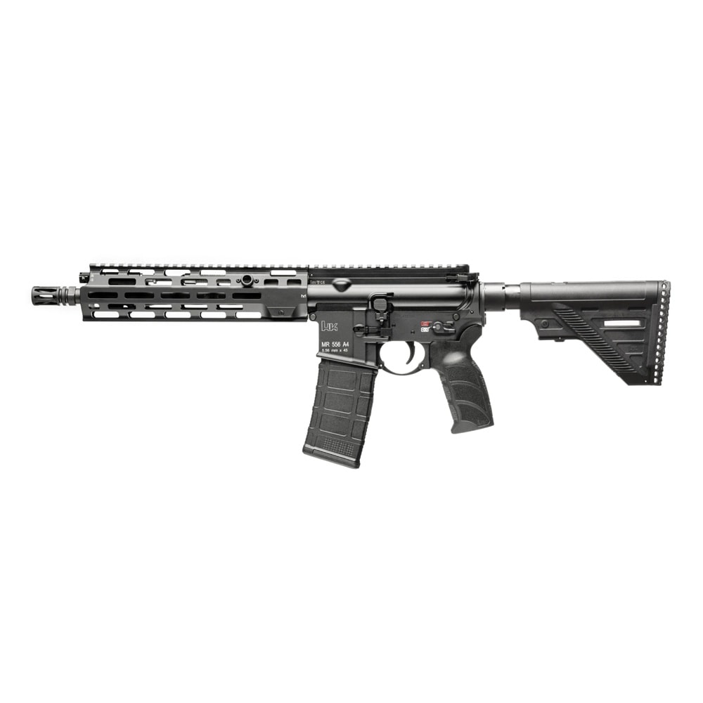 The HK MR556 A4 Short Barrel Rifle is a modern 5.56×45 mm NATO platform built on Heckler & Koch’s proven rifle lineage, featuring an 11″ barrel for a compact profile that balances maneuverability with ballistic performance. The A4 designation typically denotes a flat-top upper with a full-length Picatinny rail for easy mounting of optics and accessories, paired with a free-float handguard and modular attachment points for mission lights, grips, or other gear. Designed with an adjustable stock and ergonomic controls, the MR556 A4 supports versatile handling across dynamic shooting scenarios. This configuration includes one 30-round magazine, offering standard capacity for training or duty applications where permitted. With precision engineering and robust construction, the MR556 A4 Short Barrel Rifle delivers dependable performance and adaptability in a compact tactical package.