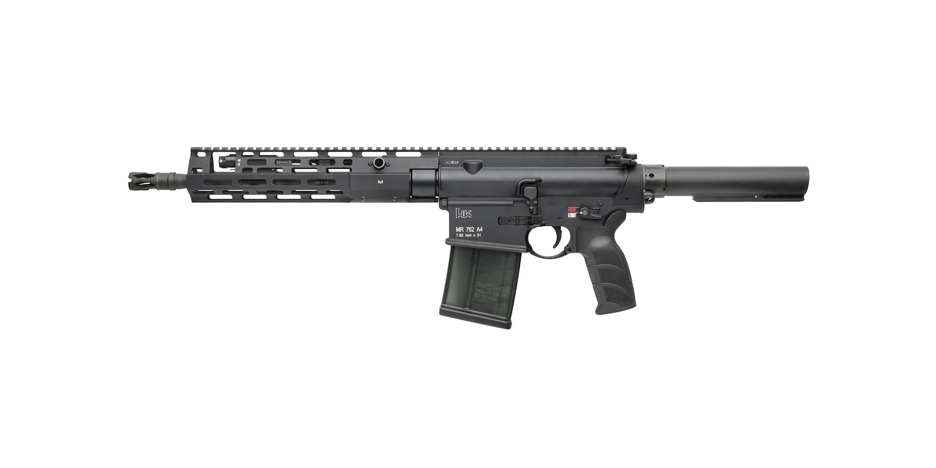 Introducing Hecklor & Koch’s all new HK MR762 A4 Pistol, HK’s latest addition to their HK MR762 308 AR-10 line up. This latest HK MR762 Pistol features HK’s new two way adjustable short stroke gas piston system and new longer M-LOK Rail. Its two way adjustable gas system is marked N for Normal and S For Suppressed, both postions are optimized for use with and without a suppressor. The HK 308 Pistol is outfitted with HK’s all new 13 inch cold hammer forged cannon grade steel barrel with a standard 5/8×24 thread pitch, making it easy to add standard suppressor adapters. Hecklor & Koch did a head to head 12,000 round test between their cannon graded steel barrel and a Mil-spec chrome lined barrel. After both barrels where shot 12,000 rounds, the HK cannon grade steel barrel out performed the Mil-spec chrome lined steel barrel in both accuracy and durability. Furthermore, the Mil-Spec chrome lined barrel showed degradation, groups opened up 2.5 times larger than its starting base line and the HK cannon grade steel barrel experienced no degradation or loss in accuracy. Also, HK believes in their new cannon grade barrel so much, that it comes with HK’s lifetime barrel warranty, if you shoot out the barrel they will replace it for free.