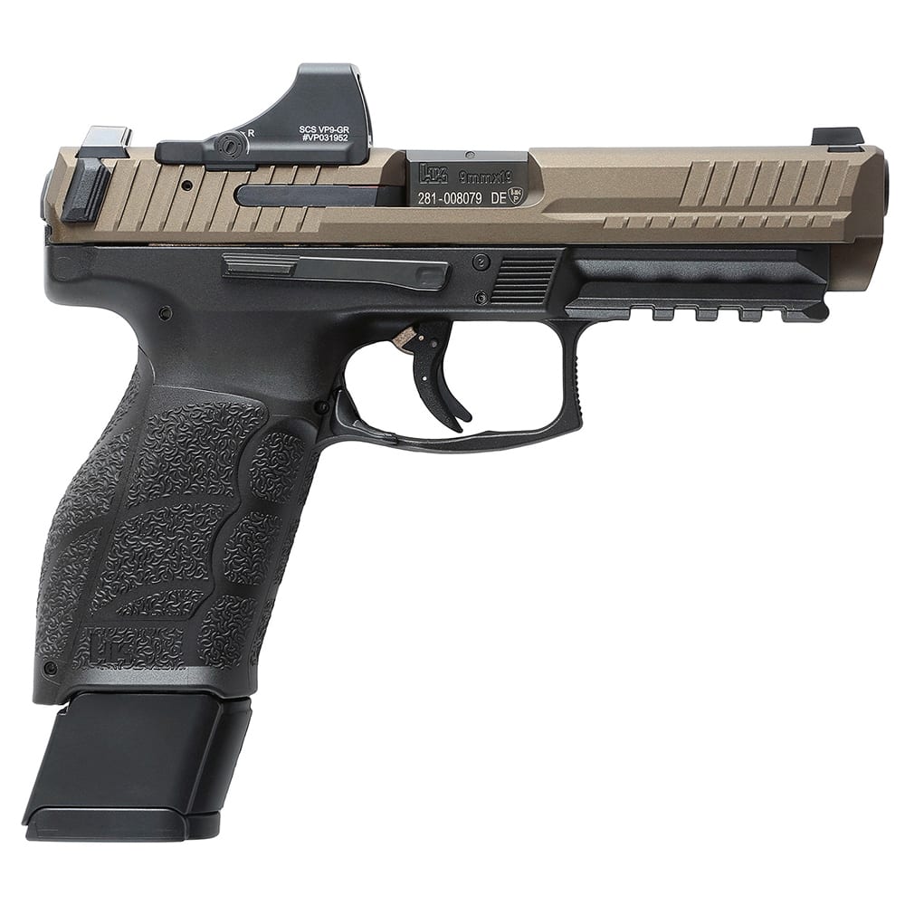 The Heckler & Koch VP9A1 F is a full-size, optics-ready 9mm Luger pistol designed for enhanced ergonomics and performance. It features a 4.53-inch cold hammer-forged steel barrel, offering a balance between accuracy and maneuverability. The pistol's polymer frame is equipped with interchangeable backstraps and side panels, allowing for a customizable grip to fit various hand sizes. The VP9A1 F boasts improved ambidextrous controls and a nickel-Teflon-coated trigger bar, resulting in a smoother trigger pull with a weight between 4.5 and 5.5 pounds.