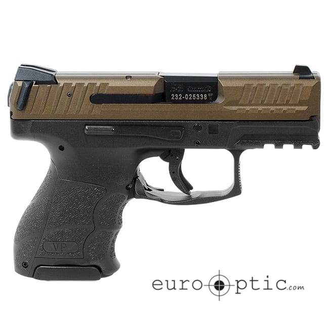 This HK VP9SK comes with a Midnight Bronze frame and (2) 10 round magazines. The VP9SK also features a scaled down version of the VP adjustable grip feature, allowing the shooter to obtain the perfect grip. Another state-of-the-art feature of the VP9SK is that all of the controls are completely ambidextrous, with slide and magazine releases on both sides of the pistol. In addition the VP9SK has an abbreviated picatinny rail molded into the polymer frame so lights and lasers can be attached with no modifications to the firearm.