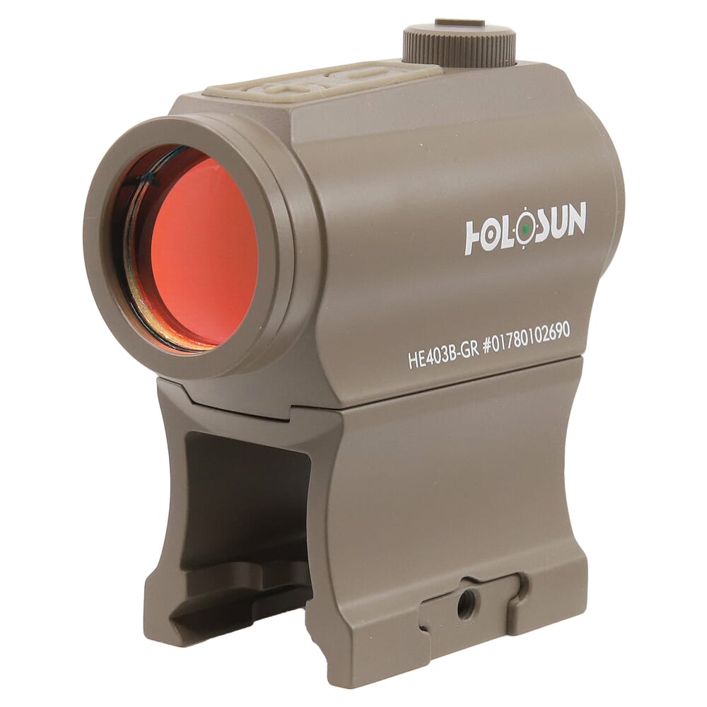 Holosun’s HE403B is the perfect addition to any modern sporting rifle/carbine setup, and offers high performance and a wide assortment of exclusive features. It utilizes a precise 2 MOA dot reticle, allowing the operator to make exact shot placement at close to mid-range, and can be paired with a magnifier for long range targets. The HE403B is also parallax free and has unlimited eye relief, allowing it to be positioned at any point on the rail, and a lower 1/3 cowitness mount allows the optic to be used in conjunction with iron sights. Like many of Holosun’s premium optics, the HE403B is equipped with the Shake Awake function, which automatically activates the reticle at the slightest movement, and deactivates it after a period of motionlessness. This means the HE403B is ready as soon as the host weapon is picked up, and will automatically deactivate to preserve battery life. The reticle is illuminated by Holosun’s Super LED and features 12 levels of brightness intensity – 10 daytime, 2 night vision – allowing the reticle to adapt to the surrounding light levels. In addition, the HE403B is outfitted with multilayer lens coatings to maximize light transmission and reduce glare.