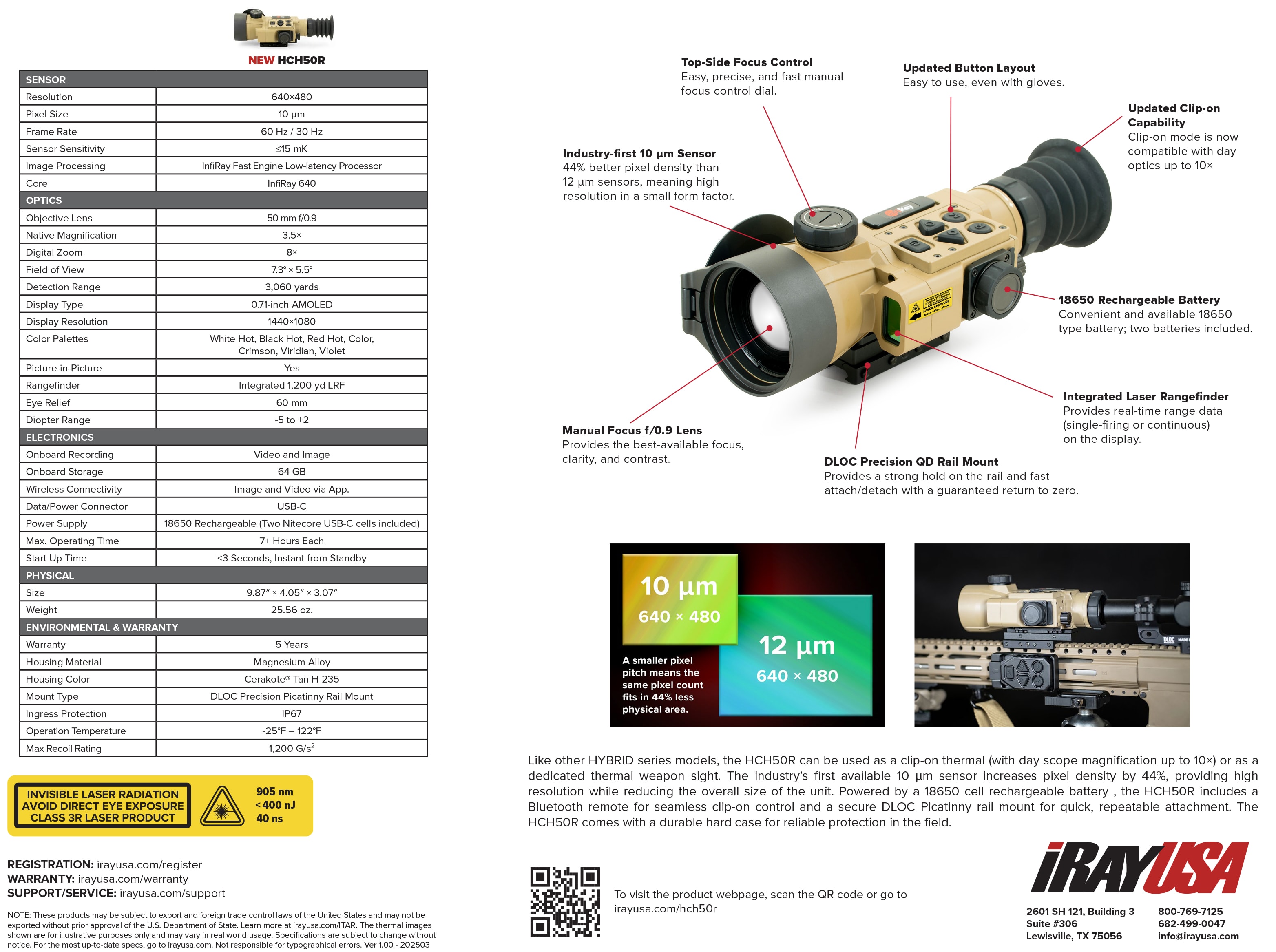 The InfiRay RICO Hybrid LRF (HCH50R) is a compact, battle-ready thermal weapon sight that blends a high-resolution 640x480, 10-micrometer sensor with a bright 3.5x/50mm optical assembly to deliver crisp thermal detection at long distances while remaining small and rugged enough for field use. Built-in laser rangefinding, an intuitive AMOLED display, and a low-latency image engine let shooters rapidly acquire targets and pair precise range data with ballistic calculations, while onboard photo/video recording and Wi-Fi connectivity keep your results documented and shareable. Designed as a true hybrid, it functions both as a clip-on for day optics and as a standalone sight, powered by user-replaceable 18650 batteries for long runtime and sealed in an IP67 magnesium housing to withstand recoil and harsh environments. Whether you need a dependable clip-on solution or a flexible multi-function sight for extended ops, the HCH50R balances cutting-edge thermal sensitivity with practical features for accurate, repeatable performance.