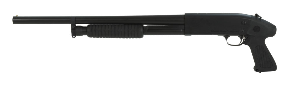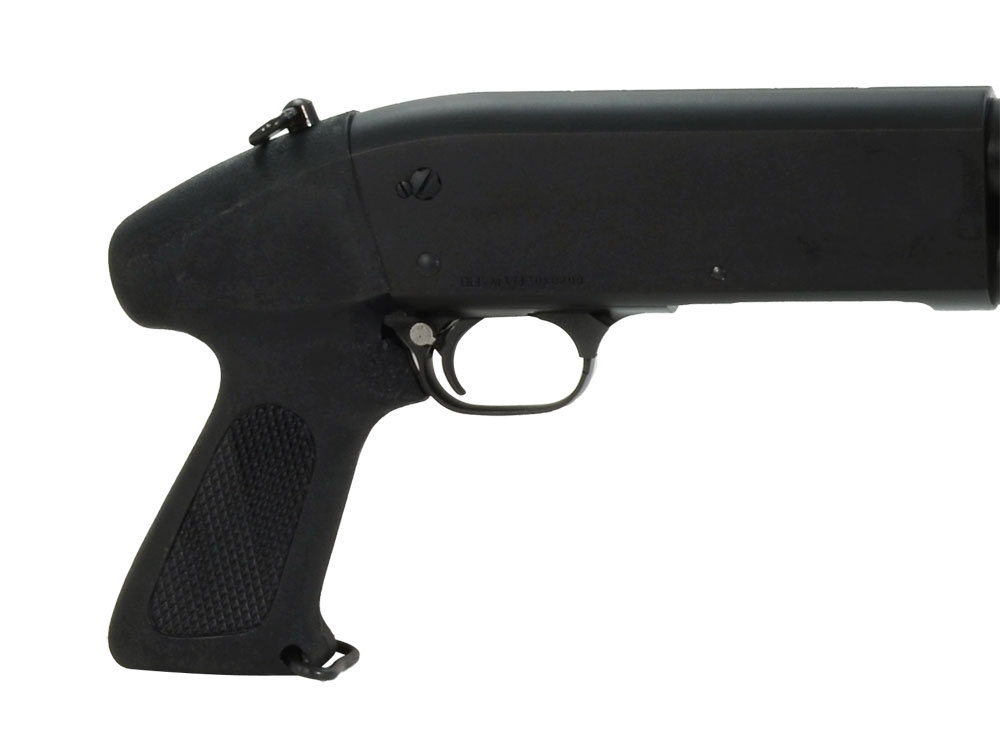 This Ithaca 37 Defense 12 gauge shotgun has a fixed steel receiver, an 18.5" fixed barrel with a standard cylinder bore, brass bead front sight, 5 shot capacity, black synthetic stock, and matte blued finish.