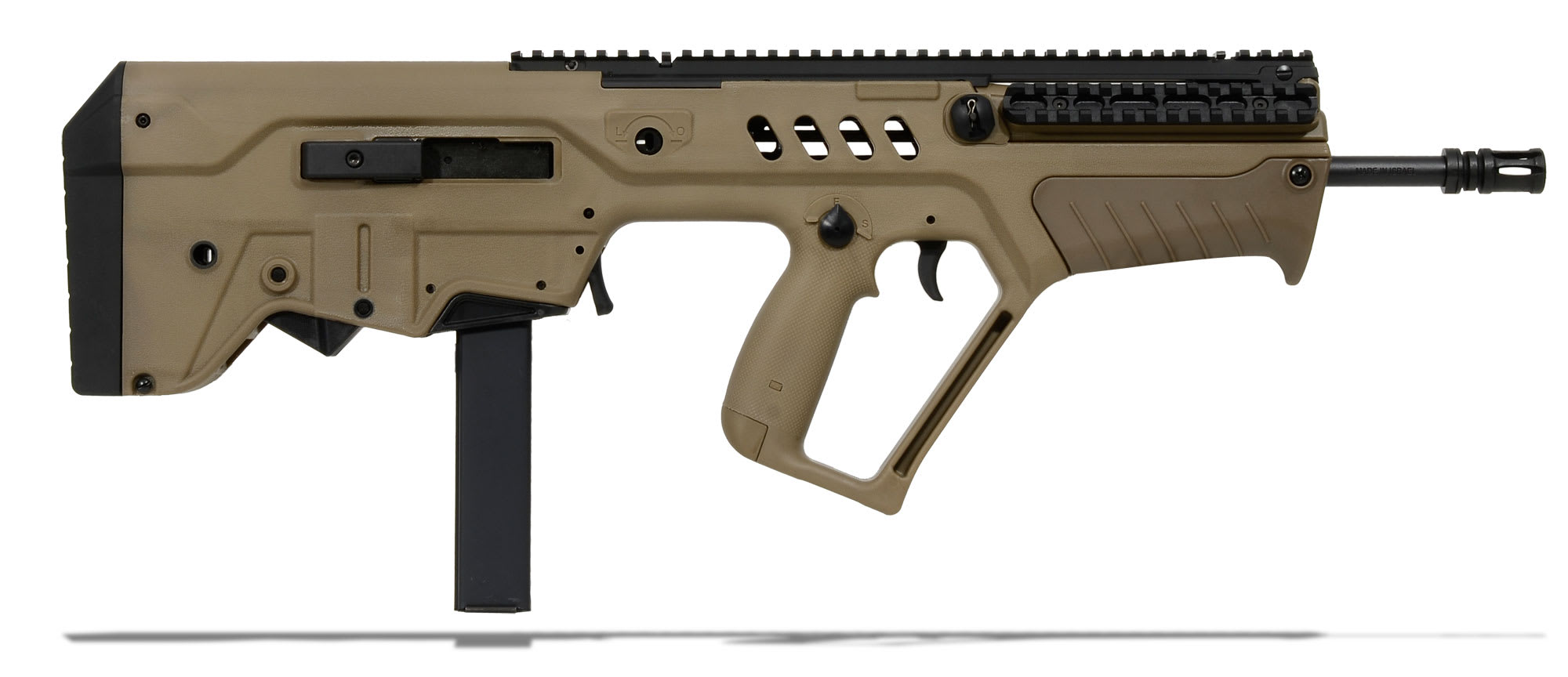 This FDE IWI Tavor Sar 9mm Flattop Rifle features a full-length picatinny top rail, short rail mounted at 45° angle opposite of charging handle, long gas stroke operating system, 17" cold hammer forged CrMoV chrome lined barrel, NATO STANAG magazine, reinforced polymer bullpup stock, and a folding front sight blade with Tritium insert and rear sight aperture.