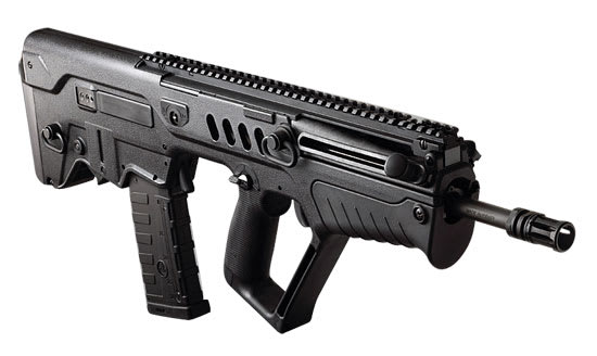 This left-hand IWI Tavor Sar 5.56 Nato Flattop Rifle features a full-length picatinny top rail, short rail mounted at 45° angle opposite of charging handle, long gas stroke operating system, cold hammer forged CrMoV chrome lined barrel, 30rd NATO STANAG magazine, reinforced polymer bullpup stock, and a folding front sight blade with Tritium insert and rear sight aperture. This left-handed model has all controls moved for left-hand operation, including the cocking handle, safety lever, QD swivel receptacles, and relocation of the forward 45° rail.