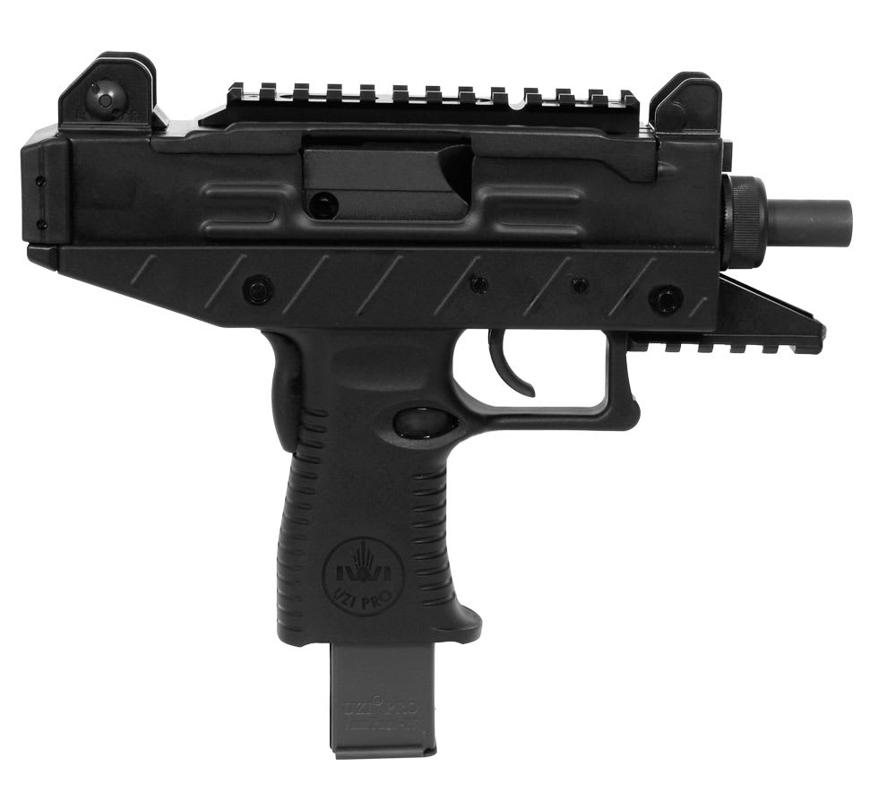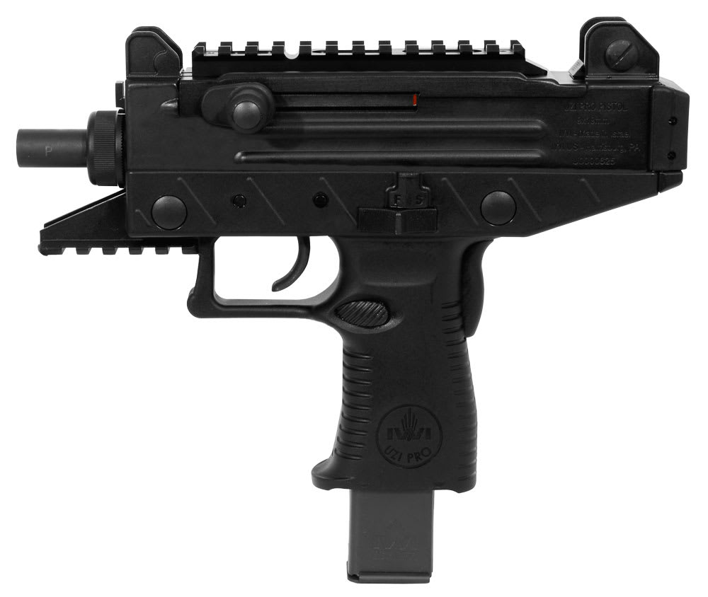 The moderized IWI UZI Pro 9mm Para pistol features a blow-black operating system, advanced polymers for weight reduction, relocated magazine release, relocated charging handle, full length top picatinny rail, lower picatinny rail, and three safety mechanisms, including a manual thumb safety, grip safety, firing pin block, and small cleaning kit.