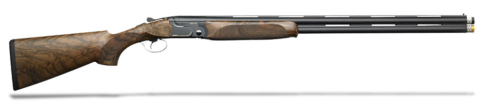 This 12-gauge Beretta 692 International Trap Black Edition features an adjustable balance system, fixed (IM, F) chokes, 30" steelium plus barrel, front bead white sight, single selective adjustable position trigger, 18mm microcore recoil pad, manual safety, international trap 2.5+ walnut stock with round forend, black matte receiver with gold accents, and a 10mmx10mm carbon fiber rib.