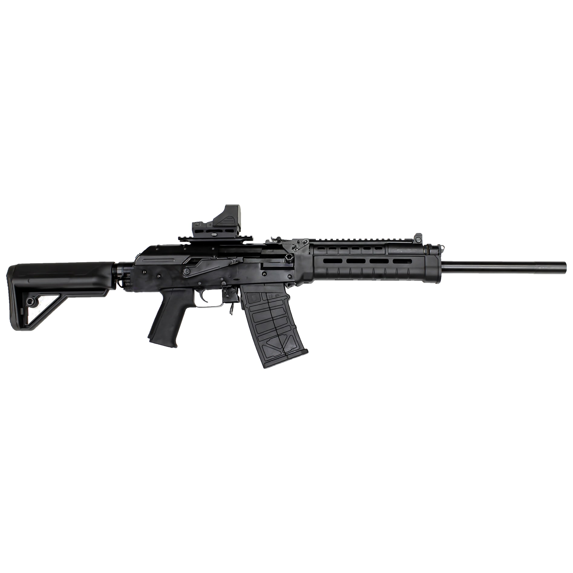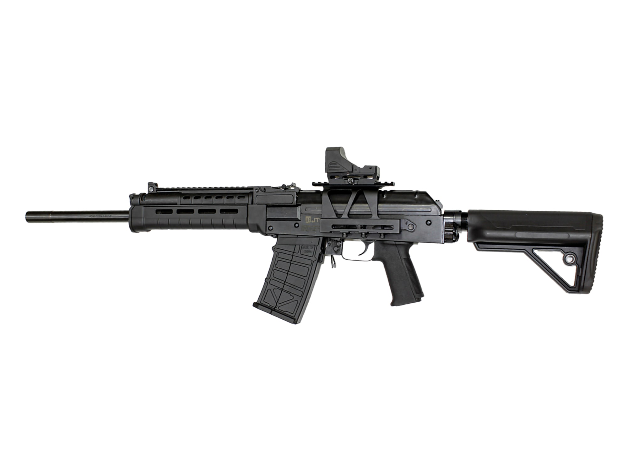 Experience the perfect blend of power and precision with the JTS M12AK-T2.1 12ga Semi-Auto Shotgun. Designed for versatility and reliability, this shotgun features an 18.7-inch barrel and a robust metal M-LOK handguard, offering enhanced durability and customization options for accessories. The integrated scope mount and included red dot sight provide rapid target acquisition, making it ideal for sport shooting.