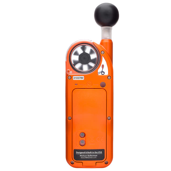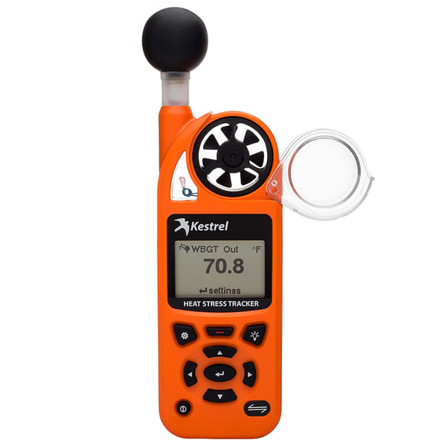 This safety orange Kestrel 5400 Heat Stress Tracker measures wet bulb globe temperature, thermal work limit, heat index temperature, humidity, and humidity. The natural wet bulb temperature is calculated from on-board digital sensors and does not require water.