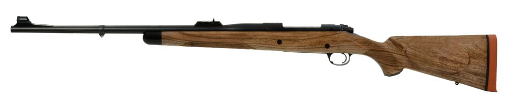 This Kimber Caprivi .458 Lott was created for hunting the world's most dangerous game. It features an AA-grade French walnut stock with a hand-cut 24 lines-per-inch checkering pattern, an ebony forend tip, a pancake cheek piece, a full-length Mauser claw, a barrel band sling swivel stud, glass and pillar bedding as well as double cross bolts for added strength, and express sights with one standing leaf regulated for 50 yards and 2 additional folders left green.