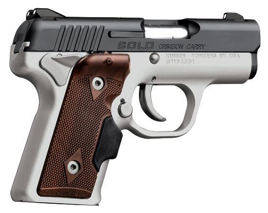 This Kimber Solo Crimson Carry 9mm pistol features dovetail mounted low-profile white dot sights, Crimson Trace Lasergrips project a red dot visible in almost every light, low maintenance stainless steel slide and barrel, and carry melt treatment for rounded and blended edges that won't snag.