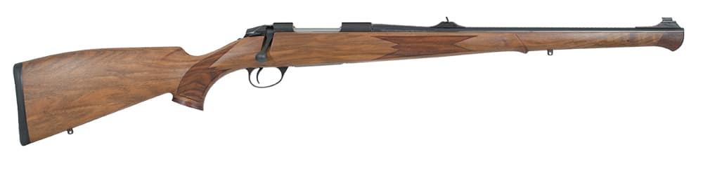 This full stocked hunting carbine has been developed for hunters who admire the beauty of walnut and black steel combined to a nice carrying, hard shooting hunting weapon. Comes always with adjustable iron sights and single set-trigger.