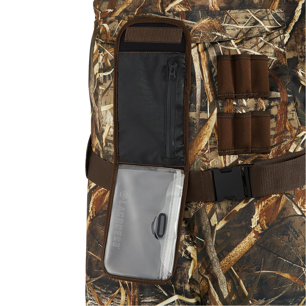 The Alpha Agility Select Waders by Lacrosse combine the comfort and maneuverability of an athletic shoe with the utility and protection of heavy duty waders. These highly versatile waders can be configured to match an individual’s preferences; they come equipped with a 120G quilted insulated liner which can be removed for use in warmer environments, and the upper portion can be quickly dropped down to convert them from chest waders to pant waders. The Alpha Agility Select Waders also come with integrated shell holders to carry up to 6 additional shotgun shells, as well as a convenient waterproof chest pocket to carry your essentials. In addition, the boots utilize a specially formulated LXA midsole compound to give the user the agility of athletic shoes and superior cushioning for all-day use. The boots also have 1600G of Thinsulate Ultra insulation too keep your feet warm, and feature a polyester Jersey knit liner to wick away moisture.