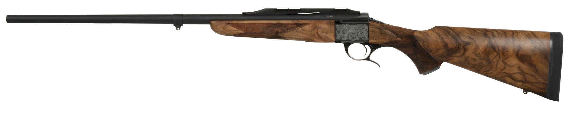 This Luxus Arms Model 11 Single Shot .270 Win rifles features hand picked wood, hand engravings, and matte metal.