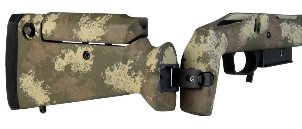 This molded woodland Manners TF1 stock is based on Remington 700 SA DBM Varmint firearms.