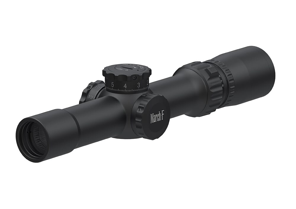 The March-F 1-8x24 Compact Tactical Riflescope is a lightweight low-power variable scope designed for use on MSR platform rifles and even shotguns. The scope is built on a 30mm main tube with a 24mm objective lens and an 8x magnification ratio. The March-F Compact features tactical exposed turrets for windage and elevation, parallax correction from 10 yards to infinity, and a tactical reticle in the first focal plane.