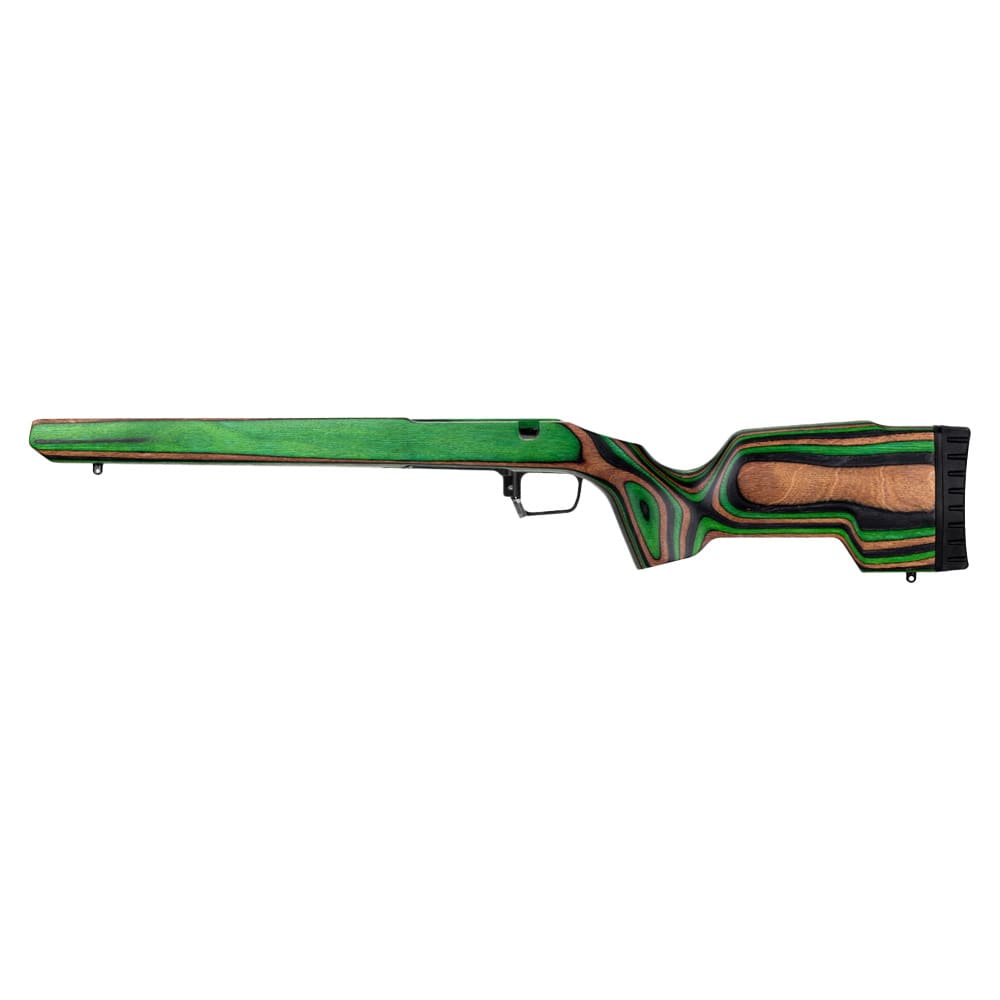 The MDT TIMBR Core Kit Laminate Chassis upgrades Ruger American short action rifles with a rigid laminate wood stock reinforced by an aluminum micro‑chassis for improved accuracy and consistency. It offers a traditional sporter feel with modern performance benefits, including V‑block bedding and drop‑in installation that requires no gunsmithing. The right‑hand configuration and durable laminate construction provide comfort, stability, and reliable field performance.