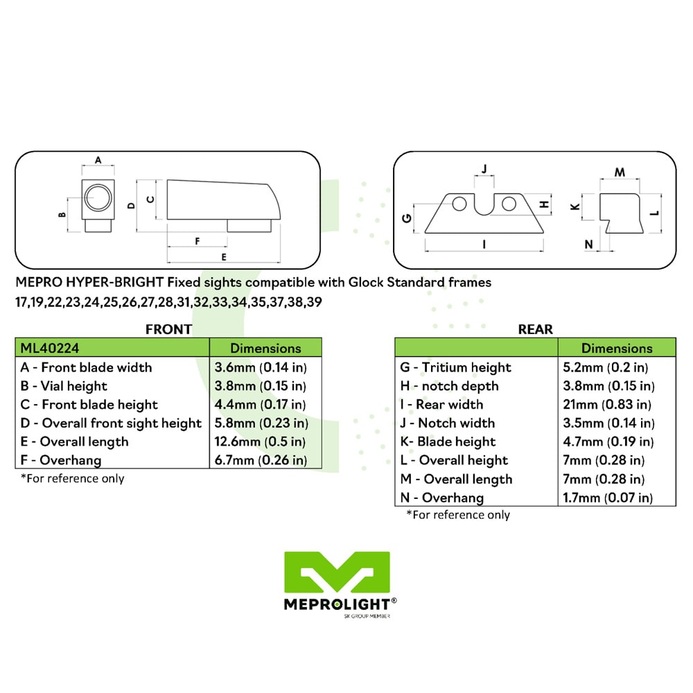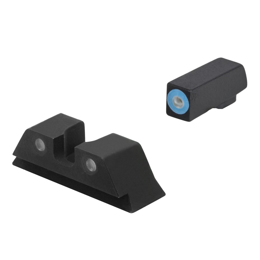 The Meprolight Hyper-Bright Plus Green Tritium Front & Rear Glock Standard Frame Blue Ring Sight Set delivers the brightest tritium pistol sights on the market, featuring premium Swiss-made green tritium vials in both the front and rear sights with a bold blue contrast ring on the front for rapid daytime target acquisition on Glock 17, 17L, 19, 22, 23, 24, 25, 26, 27, 28, 31, 32, 33, 34, 35, 37, 38, 39, and 45. The U-notch rear sight naturally guides the eye to the top of the front sight for an instinctive sight picture in any lighting condition, while the ultralight snag-free steel construction is drop-proof, shockproof, and installs directly on the factory slide with no modifications required. Requiring zero batteries and backed by a 12-year tritium illumination guarantee, these sights are always on, always ready — 24 hours a day, 7 days a week.