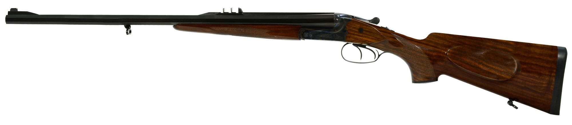 This Merkel 140 .470 Nitro Express side-by-side Safari Double Rifle features color-case hardened, Anson & Deeley locks, 23.6" octagon barrels, Greenerstyle cross bolt and double bottom bite, double trigger with articulated front trigger, manual safety with intercepting sears, ejectors, African express sight, pistol grip, cheekpiece, straight class 5 wood stock, and a rubber recoil pad.