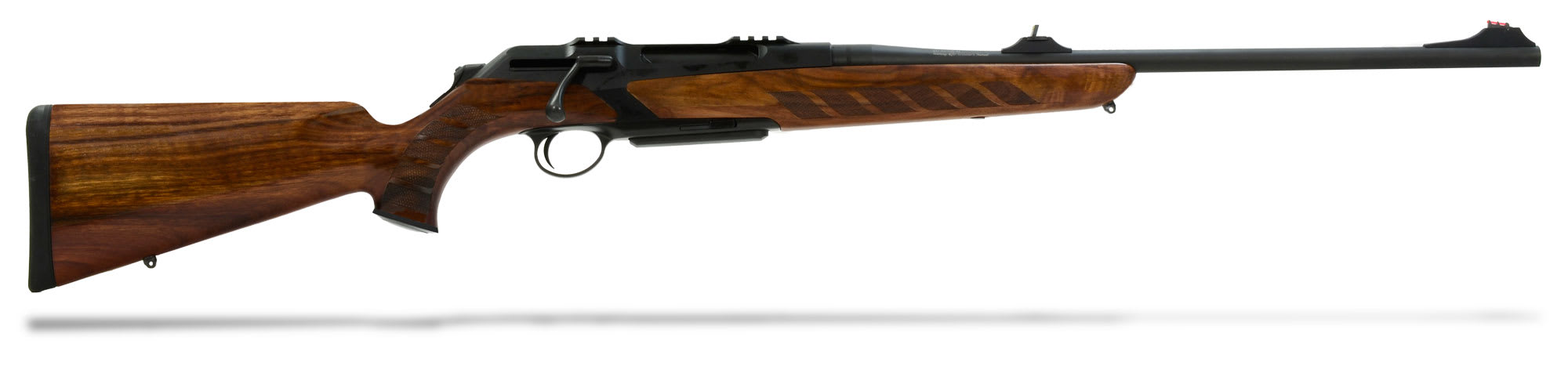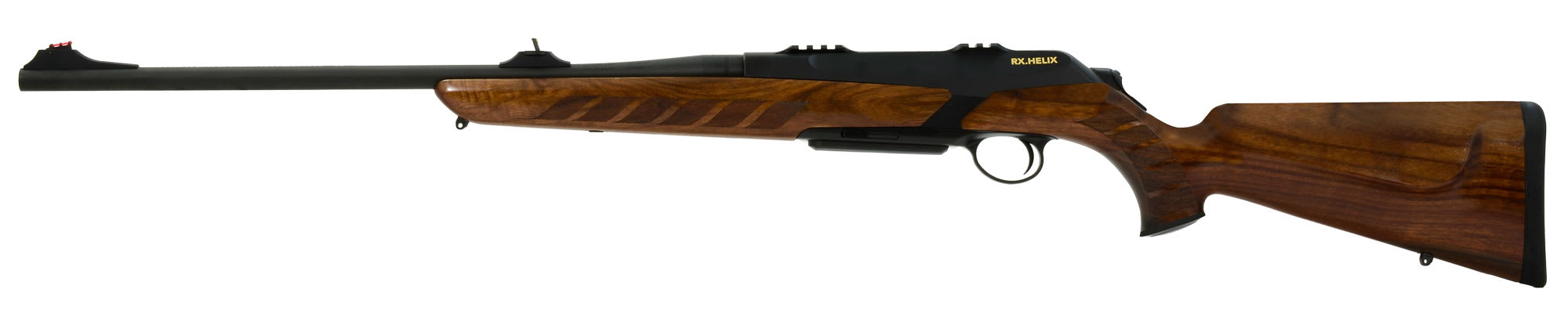 This black Merkel RX Helix .243 Win rifle features a wood grade 2 stock, detachable magazine, sliding thumbpiece decocking system, and an interchangeable barrel system.