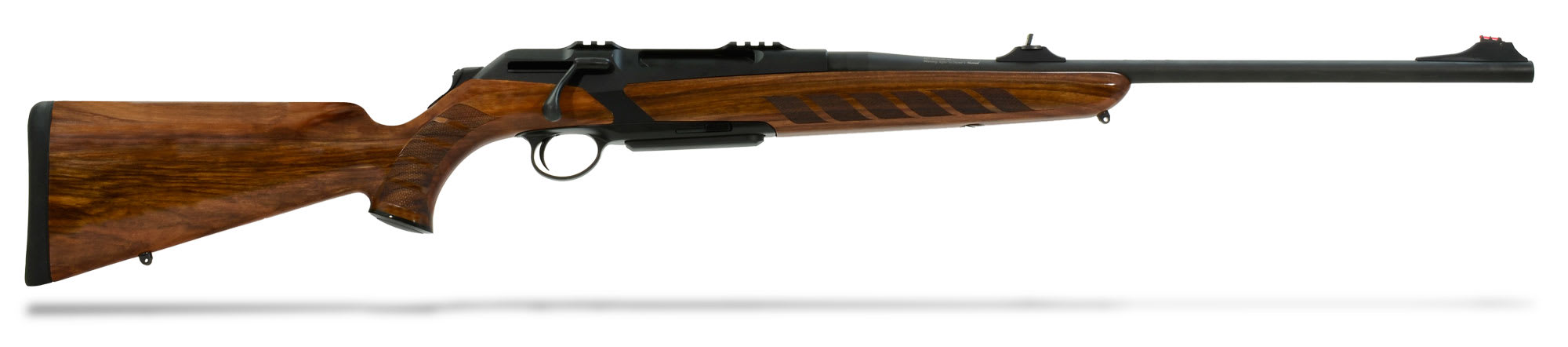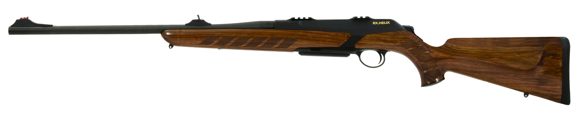 This black Merkel RX Helix .223 Rem rifle features a wood grade 4 stock, detachable magazine, sliding thumbpiece decocking system, and an interchangeable barrel system.