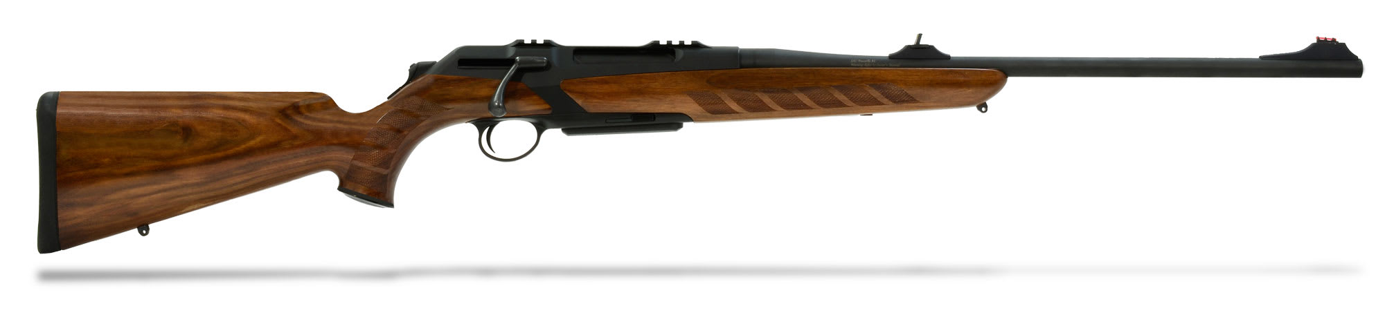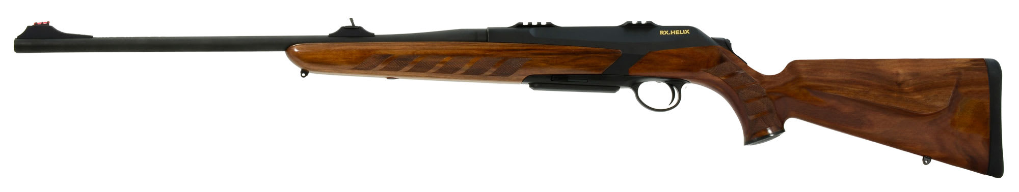 This black Merkel RX Helix .270 Win rifle features a wood grade 2 stock, detachable magazine, sliding thumbpiece decocking system, and an interchangeable barrel system.