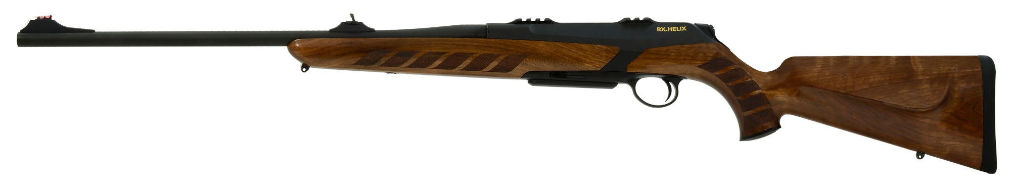This black Merkel RX Helix .308 Win rifle features a wood grade 2 stock, detachable magazine, sliding thumbpiece decocking system, and an interchangeable barrel system.