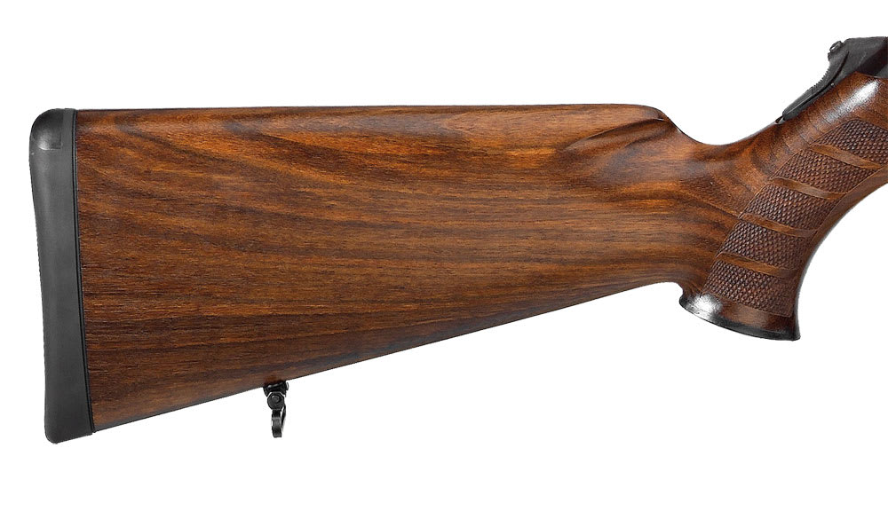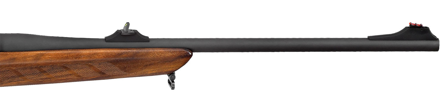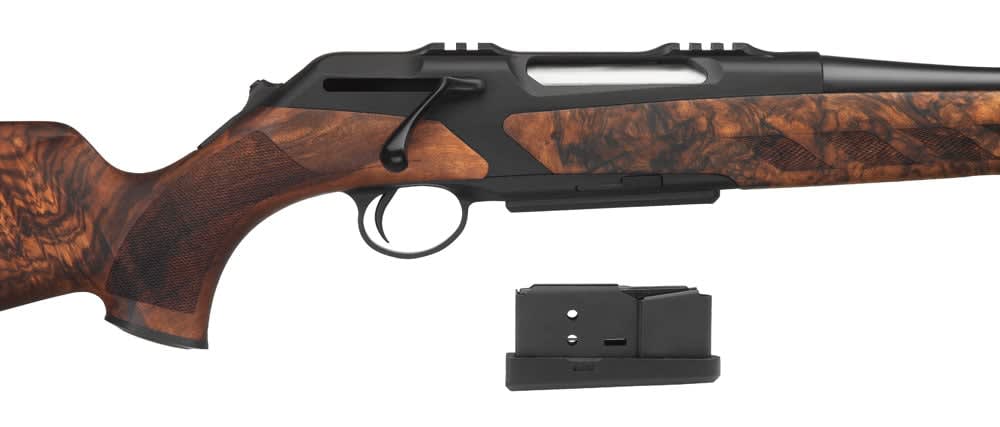 This black Merkel RX Helix 6-5x55 Swedish rifle features a wood grade 2 stock, detachable magazine, sliding thumbpiece decocking system, and an interchangeable barrel system.
