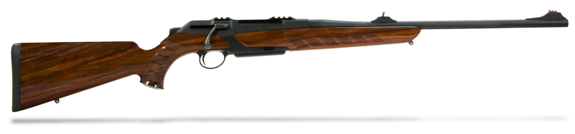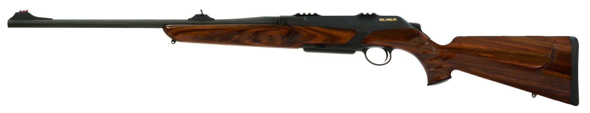 This black Merkel RX Helix 9-3x62 rifle features a wood grade 2 stock, detachable magazine, sliding thumbpiece decocking system, and an interchangeable barrel system.