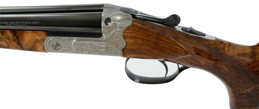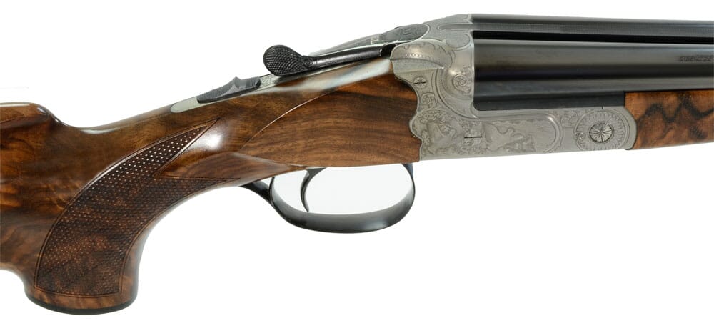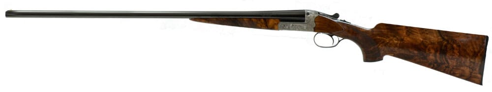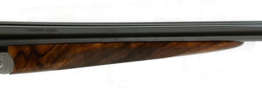 The Merkel 280EL SxS 28-gauge Shotgun features blued barrels, hunting scene engravings on the receiver, and H&H ejectors.