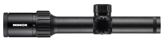 This Minox ZX5i 1-5x24 scope with Plex Absehen reticle features a large field of view, special optical high-tech glass, sharpness and clarity in low light situations, infinitely variable reticle illumination, position sensor that automatically deactivates illumination, M* multi-coating, 1/4 MOA elevation and windage adjustments, shock and scratch resistant aluminum housing, comfortable variable power adjustment, quick adjusting ocular, argon gas, and waterproof/fogproof internal lenses.