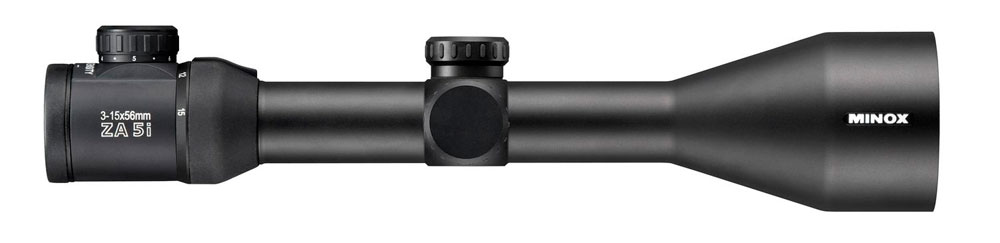 This Minox ZA HD 3-15x56 riflescope with an illuminated plex reticle features German HD optics, aluminum tube, anodized scope body, 5x zoom range, long eye relief, large field of view, reticle at the second focal plane, side focus parallax adjustment, and an argon gas filled and waterproof construction.