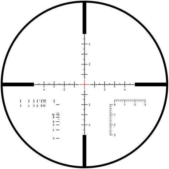 This Minox ZP5 TAC 3-15x50 riflescope with MR2 reticle is known for its 5x zoom ratio with large field of view, sophistacted tactical reticles with finely dimmable illumination, 28 mrad double turn elevation with zero stop, visible indicator for second revolution, and parallax adjustment from 50m to infinity within 180° of rotation.
