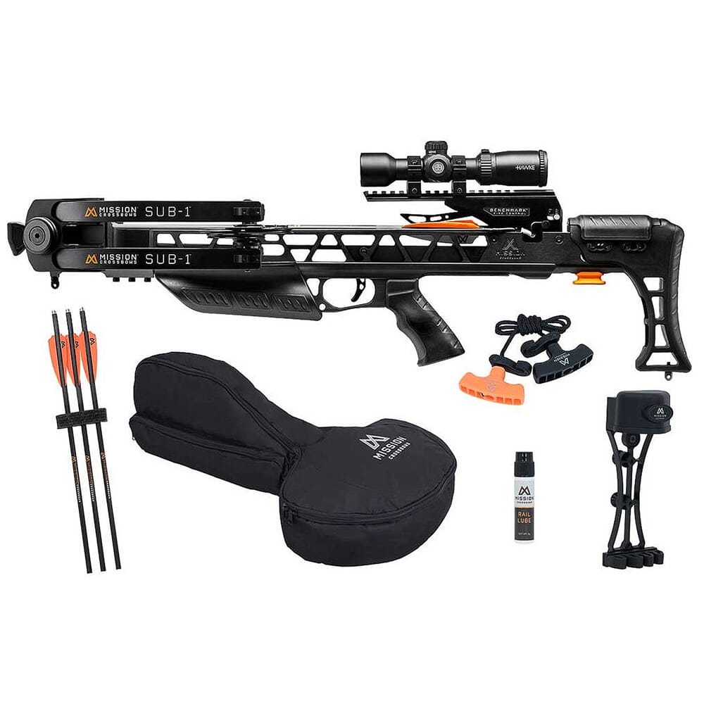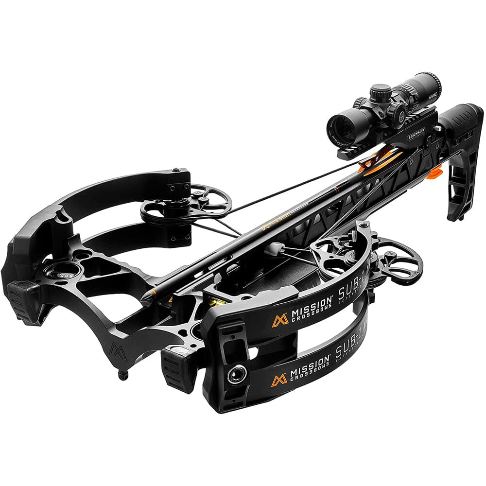 The Sub-1 XR delivers extreme accuracy, versatility, and sends bolts down range at 410 feet per second – making it the fastest shooting crossbow made by Mission. Like the other crossbows in the Sun-1 family, the Sub-1 XR gets its name from its ability to consistently shoot 1-inch groupings at 100 yards. This rifle-like accuracy can be attributed to an extensive development process, innovative technologies, and user-friendly features. One of the SUB-1 XR’s more notable aspects is its Controlled Acceleration. This feature is essentially the heart of the SUB-1 XR, and utilizes multiple systems, rather than one specific part. The Controlled Acceleration starts with a CNC machined flight deck as well as two round and coaxial Sync X Cams – the combination of which results in the elimination of vertical and horizontal nock travel and a constant string travel distance, giving the SUB-1 XR its signature level of accuracy. The Sync X Cams also provide 80% let-off, making the crossbow effortless to cock/de-cock. The SUB-1 XR’s long range precision is perfectly complimented by its ease of use and user adjustability. Unlike the majority of crossbows in the same class, the SUB-1 XR doesn’t require a bow-press to replace strings or cables thanks to the ground breaking Back Out System (B.O.S.) on the limb bolts, allowing the user to service the SUB-1 XR in the field. The fit and feel of the SUB-1 XR can also be finely tuned to the shooter’s preference; the stock’s length of pull can be altered in 6 positions, as well as a comb height that can be adjusted by 1.25 inches. The SUB-1 also features a AR-style pistol grip, offering excellent ergonomics and can be replaced with non-beavertail aftermarket AR-type grips. In addition, the SUB-1 XR is equipped with Mission’s innovative Benchmark Fire Control. This system was developed over the course of 3 years, and features a 2-stage match grade trigger outfitted with a fully contained rolling sear that breaks cleanly at 3.0 pounds. An added benefit to the Benchmark Fire Control system is it allows the user to safely de-cock the crossbow without pulling the trigger or firing a bolt, meaning no more broken bolts, discharge-heads, or bag targets.