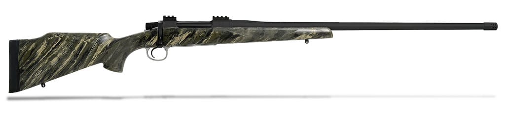 This 28 Nosler MOA Evolution Rifle features a 90° bolt handle, McMillan BDL tan/black/white stock, BDL bottom metal, Evolution action with .001 tolerance, .235 recoil lug, external bolt stop, M16 Badger Ordance extractor, Timney trigger, black cerakote #4-5 groove match grade 24" barrel, and multiported removable muzzle brake. Does not include scope.