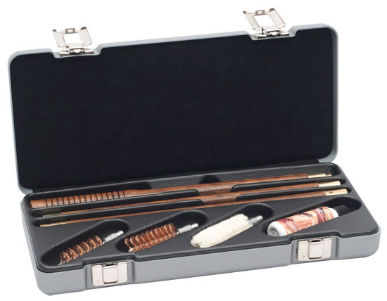 This 12-gauge Negrini Cleaning Kit includes teak wood cleaning rod, wool mop, hurricane brush, bore brush, and still crin oil in a black ABS case.