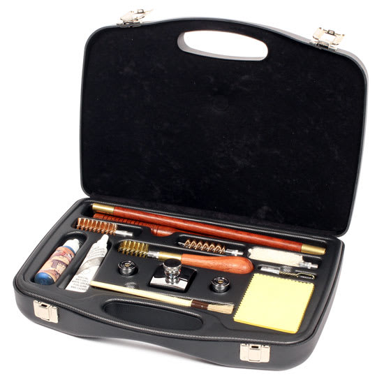 This 12-gauge Negrini deluxe cleaning kit includes a teak wood rod, wool mop, copper brushes, felt patches, still crin oil, white lube, receiver brush, leather trim, and wood finish in an ABS locked case.