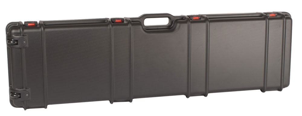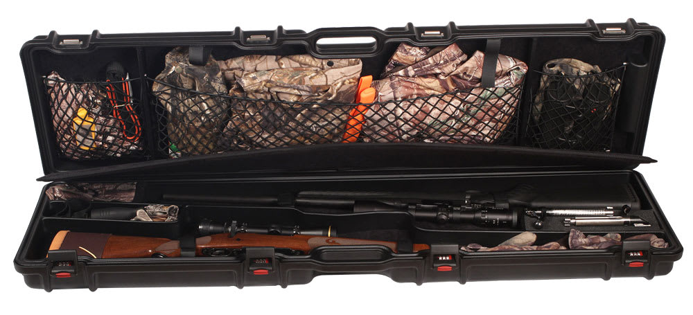 Lightweight and air travel certified, this Negrini Rifle Case holds two bolt action rifles with scopes in the lower compartment with room for travel necessities in the upper compartment with three cargo net storage spaces.