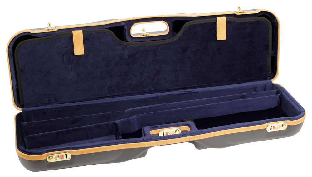These luxury, extra deep Negrini Gun cases hold two 34-5/8" medium rib over-under and/or side-by-side shotguns and three barrels. Features include a black exterior and a blue interior.