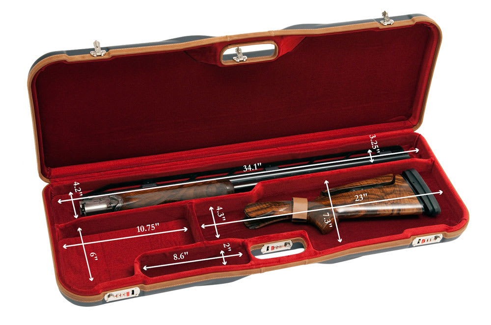 This Negrini Shotgun high rib case fits one 34" Trap or Sporting over-under shotgun. Features Include a blue exterior and a red interior.