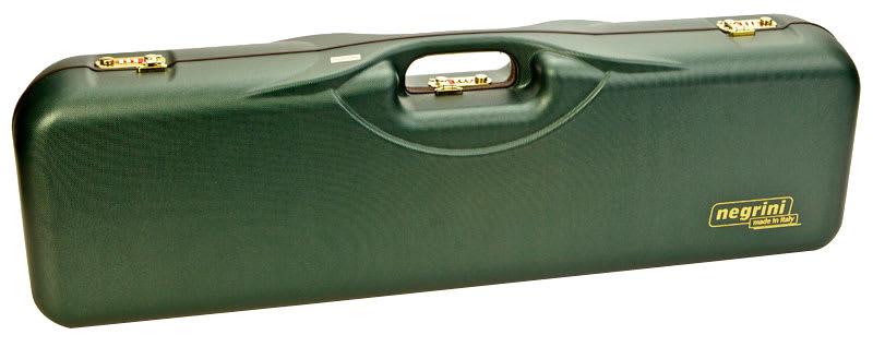 This Negrini Case holds one over-under or side-by-side medium rib shotgun and three barrels. This shotgun case is made from durable ABS and features a green exterior and brown interior.