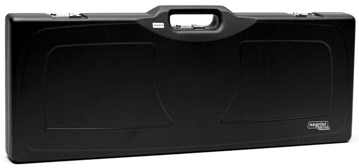 This Negrini Case holds one high rib, over-under budget ABS Trap Combo shotgun and two barrels. This case has hard walls and features a black exterior and a bordeaux interior.