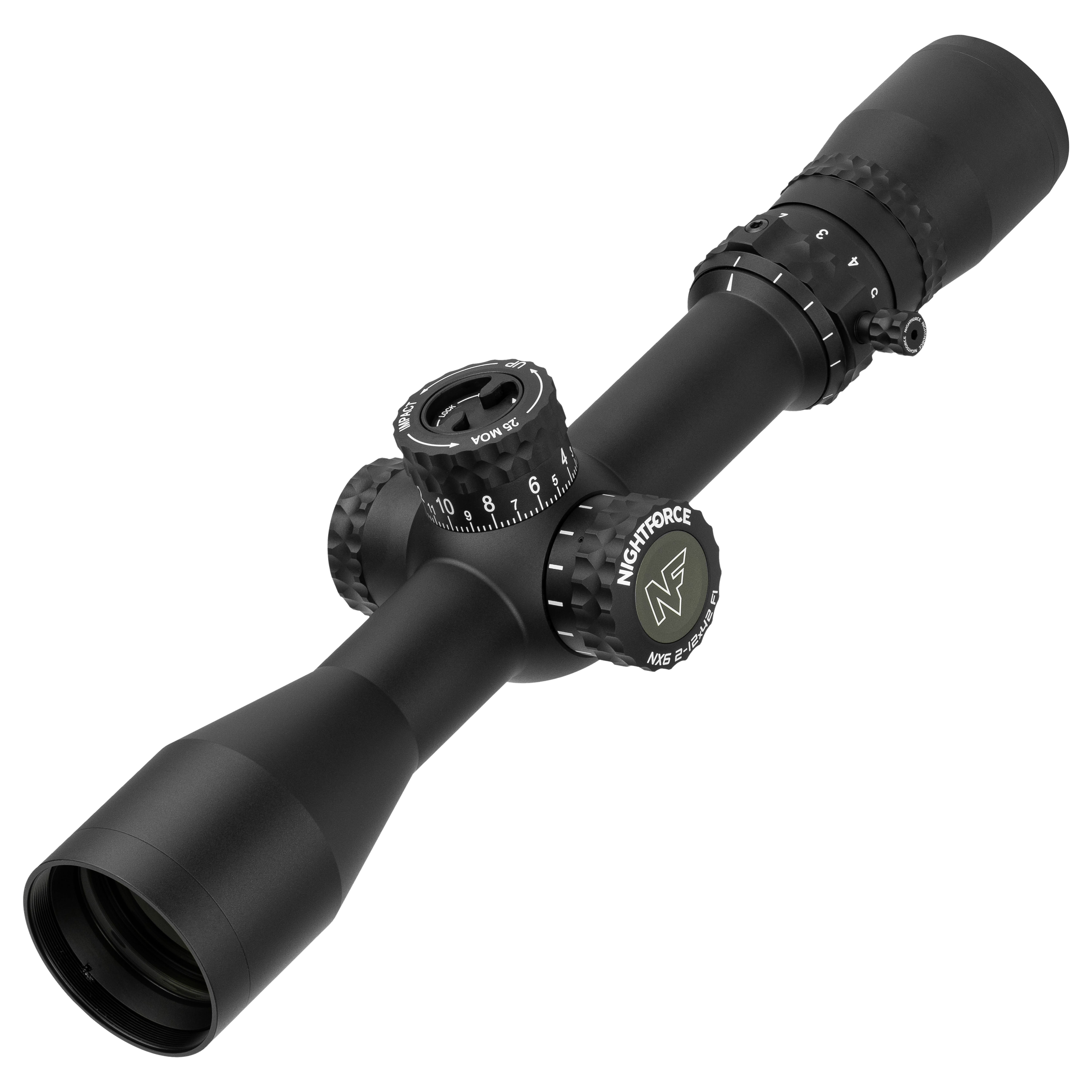 The NX6 2-12x42mm F1 with the FC-MRx (MOA) reticle delivers precision and flexibility for shooters who prefer MOA-based adjustments. The First Focal Plane reticle maintains accurate subtensions across the entire magnification range, making it ideal for ranging, holds, and fast corrections in dynamic shooting environments.