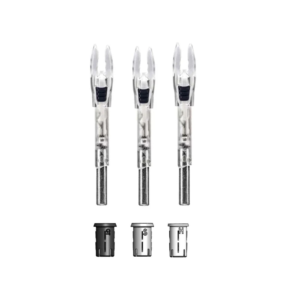 The Nockturnal Shift Universal Strobing Red/Green Lighted Nock 3pk NT-832 combines the best of both worlds with its alternating red and green LED illumination. These lighted nocks feature a patented, string-activated, piston-driven contact linear switch that triggers the strobing effect upon release, making it easy to track your arrow's flight path. The external on/off switch allows for quick deactivation, while the impact-resistant polycarbonate construction ensures durability. Compatible with X, H, S, and GT arrows, these nocks provide over 20 hours of battery life, making them perfect for low-light hunting and target shooting.